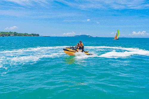 马达轰鸣、浪花飞溅、高潮迭起,摩托艇就如同离弦之箭在海面上驰骋飙浪,感受海水海风迎面而来的力量感,在天海一线的画卷里尽情撒野~