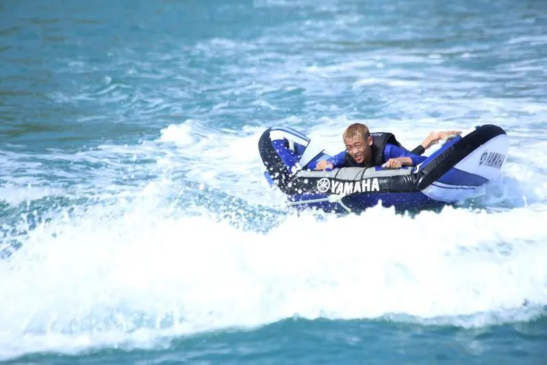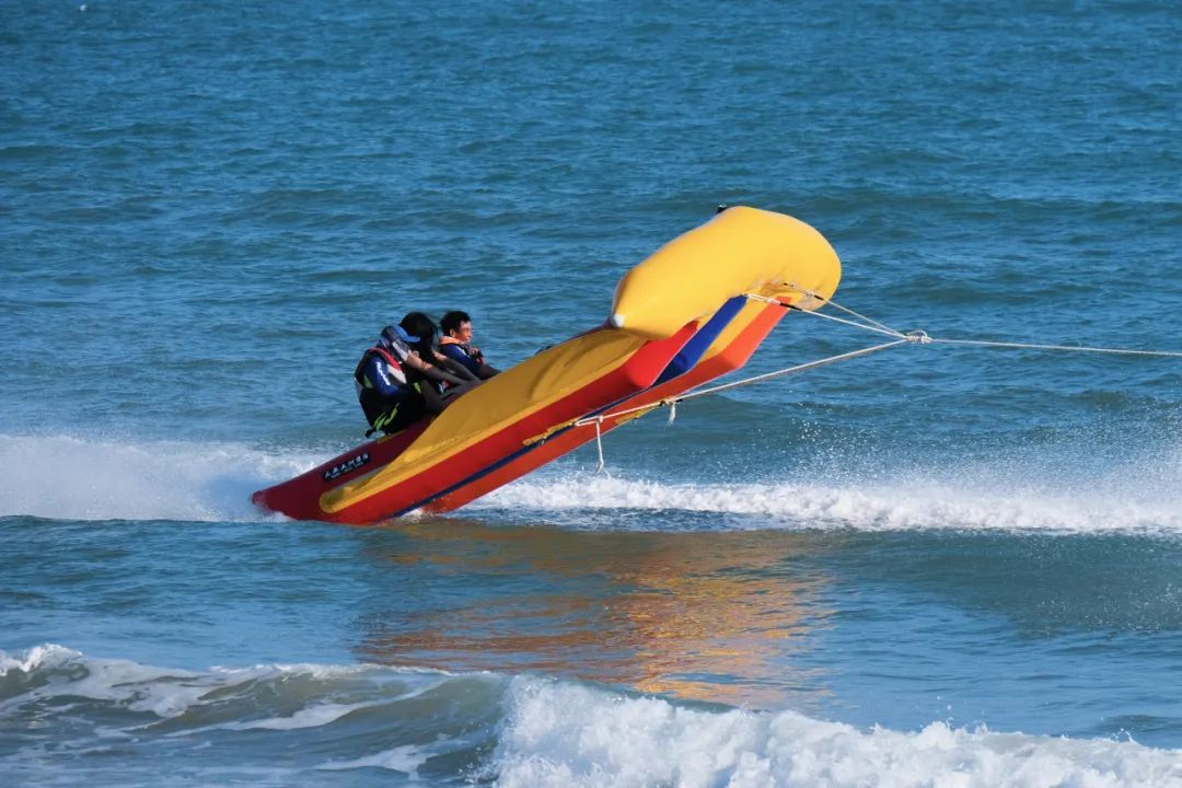 大飞鱼在快艇的牵引下极速飞驰,随着快艇向左,向右疾驰,不时还会猛地腾空飞起,刺激程度拉满,让你尖叫连连,可要抓紧把手哦!