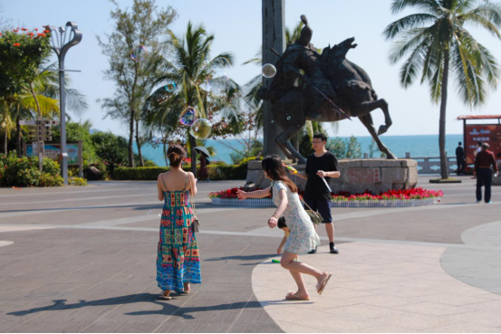 一位老家在外地留琼过年的游客说:“因为在三亚工作,为了响应国家‘就地过年’号召没有带着妻儿回家,所以趁着这个机会就到三亚的各个景区逛逛。像今天来到天涯海角,就觉得非常舒适、自由,景区的氛围营造、民俗表演和广播音乐都非常应景,让人感受到了浓浓的年味。此外,景区也有很多亲子项目和海上旅游项目供我们选择,孩子也玩得很开心。”